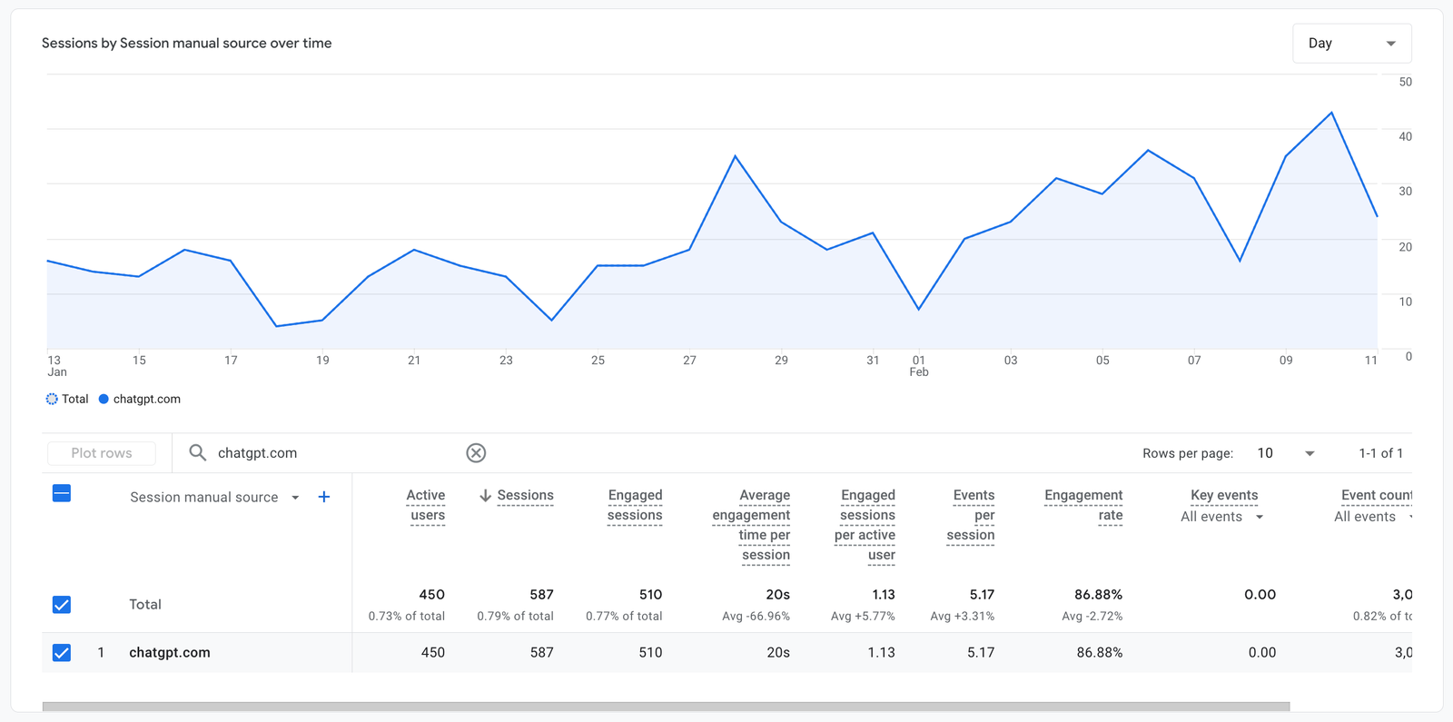 While I think it’s a great feature, I’ve decided not to enable it on my websites—and I have good reasons. AI assistants like ChatGPT are already driving a significant amount of traffic to my projects. For example, the website shown in the Google Analytics screenshot below receives around 450 visits per month from ChatGPT alone, and I’m happy with that.